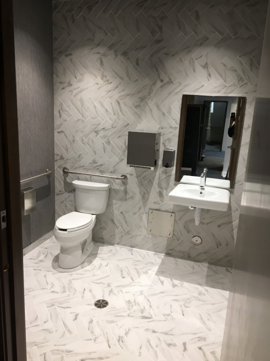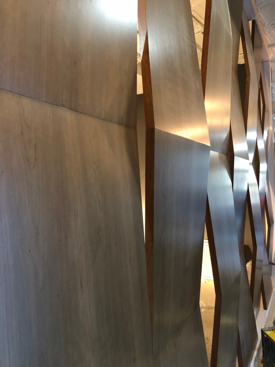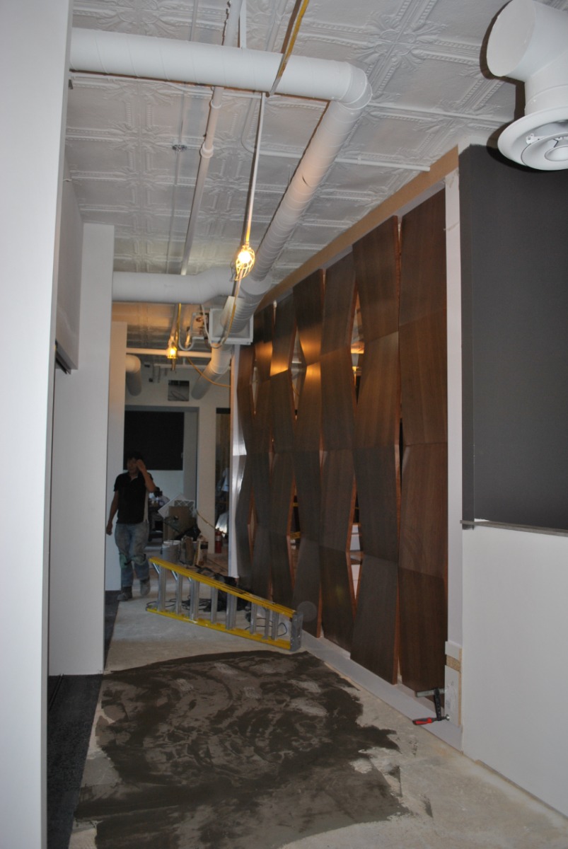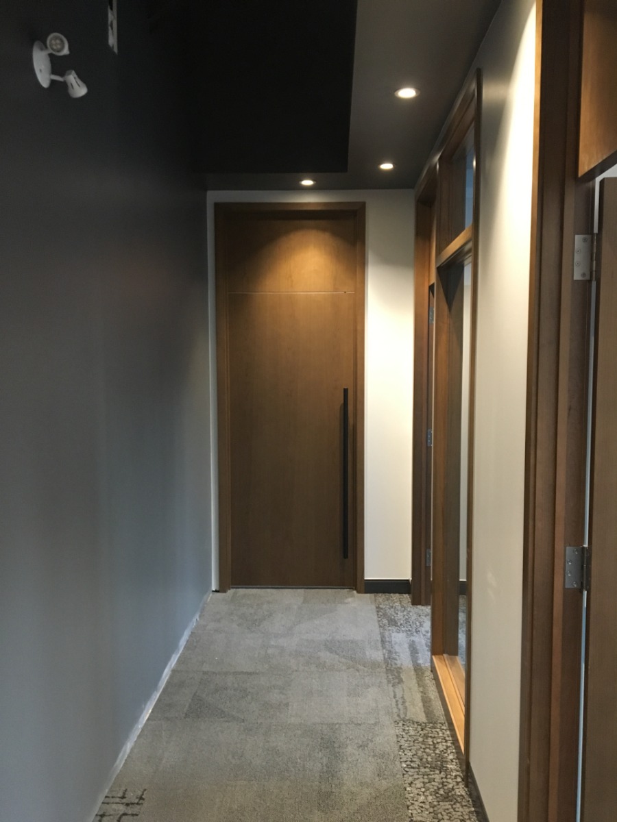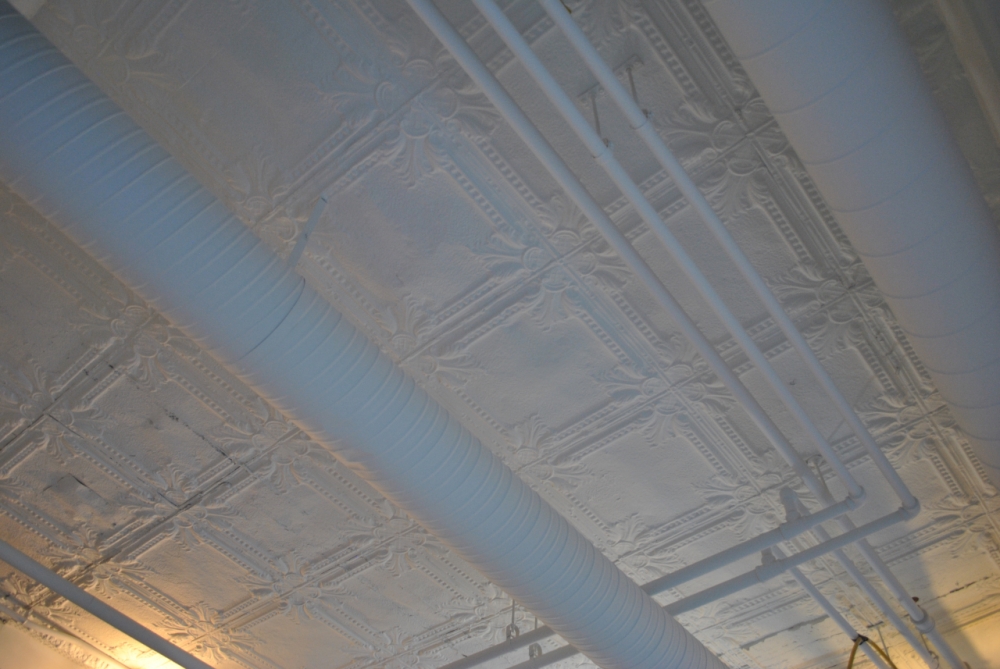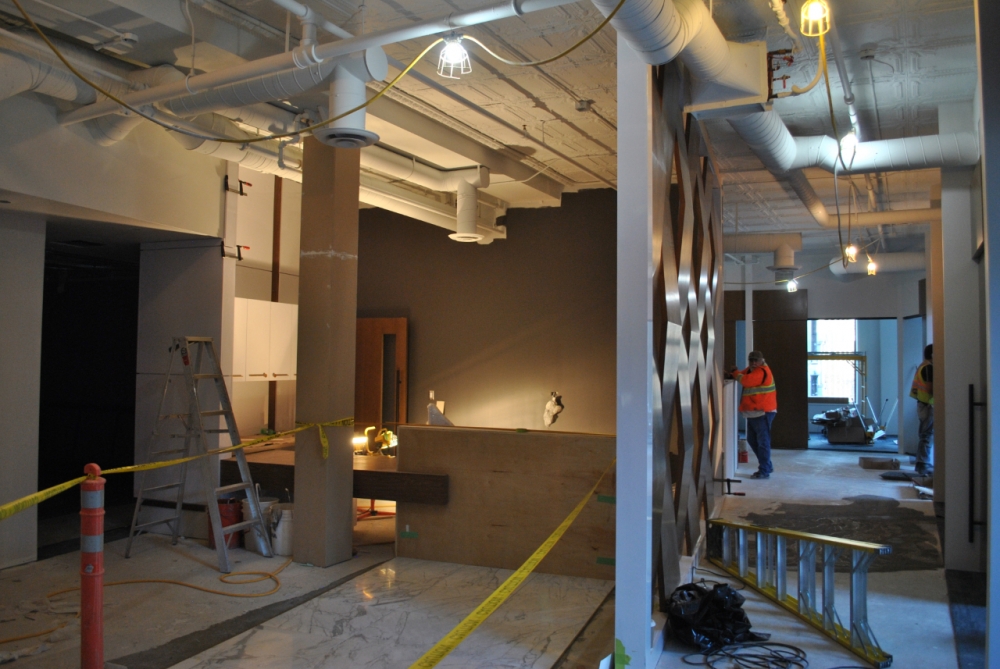 Arnott & Associates did wonderful work with the interior design. We rejuvenated the original tin ceiling, and worked hard to match that tin ceiling with new pieces where it was needed. In these photographs you can't miss the large wood beams and columns, along with plenty of glass and black metal accents that enhance the heritage style. The moment you walk into the front door, your eyes are drawn to the waterfall of marble flowing from the countertop of the front desk to the floor beneath your feet.