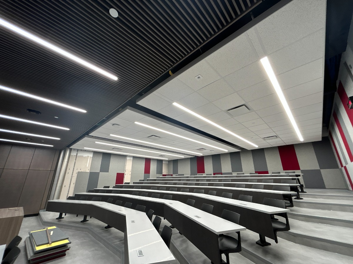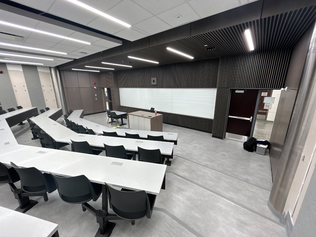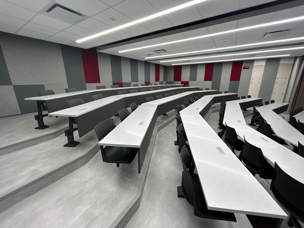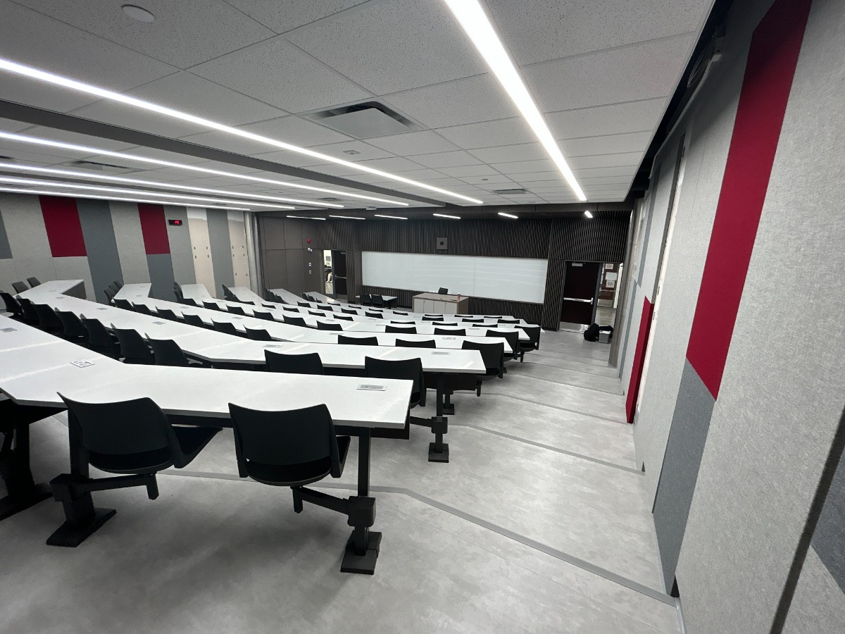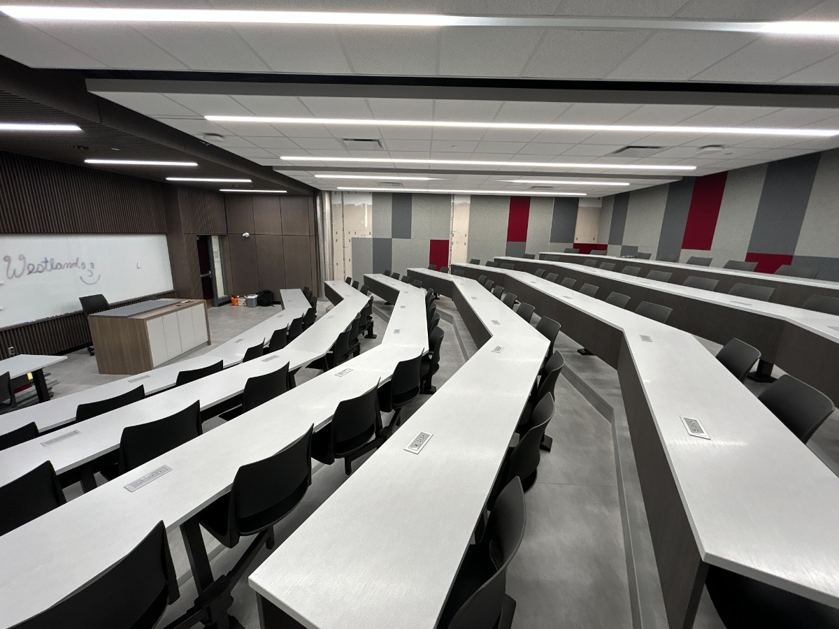 Project consisted of demolition of existing finishes, installation of new audio-visual system, VAV, lighting and architectural finishes throughout lecture rooms. These finishes included new wood panelling, paint, ceilings, flooring and furniture.