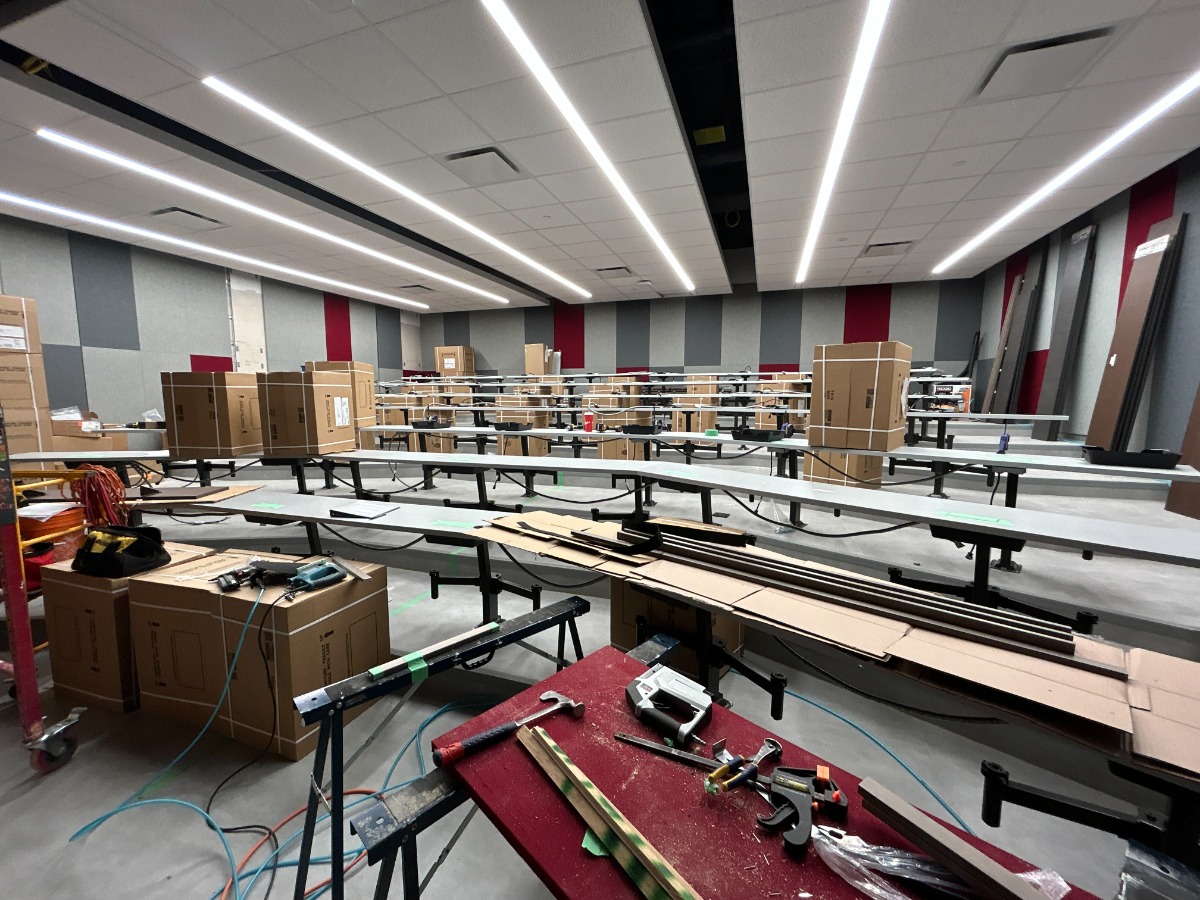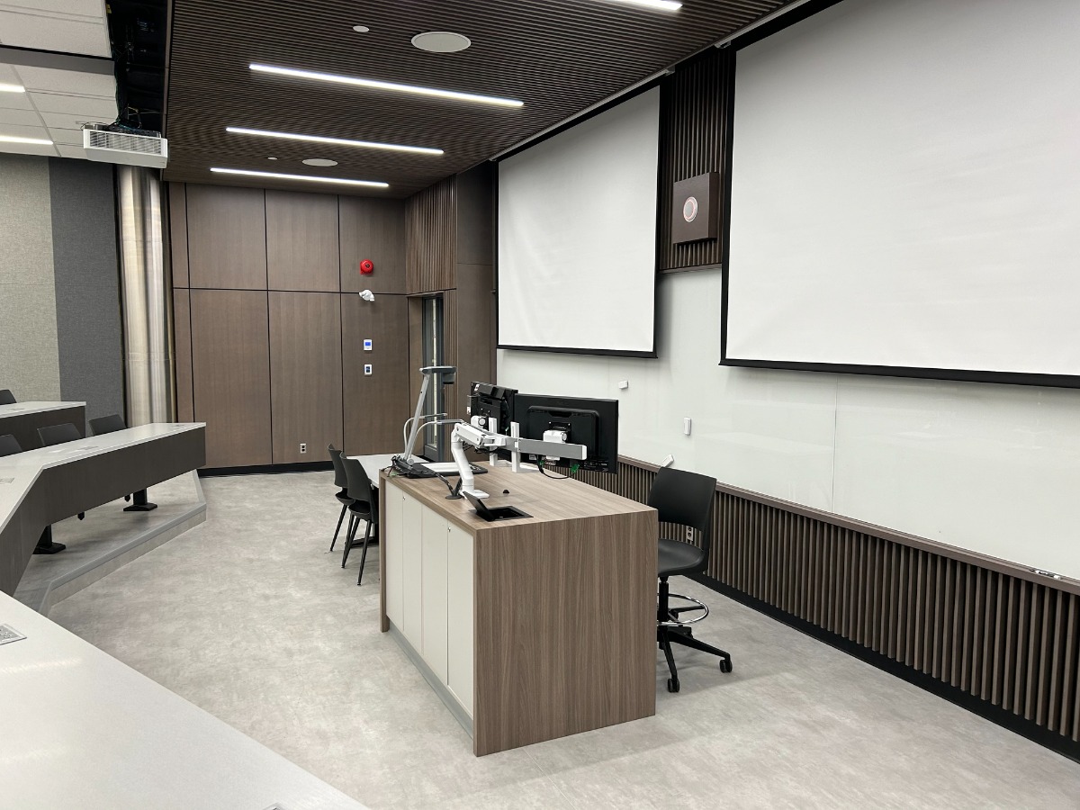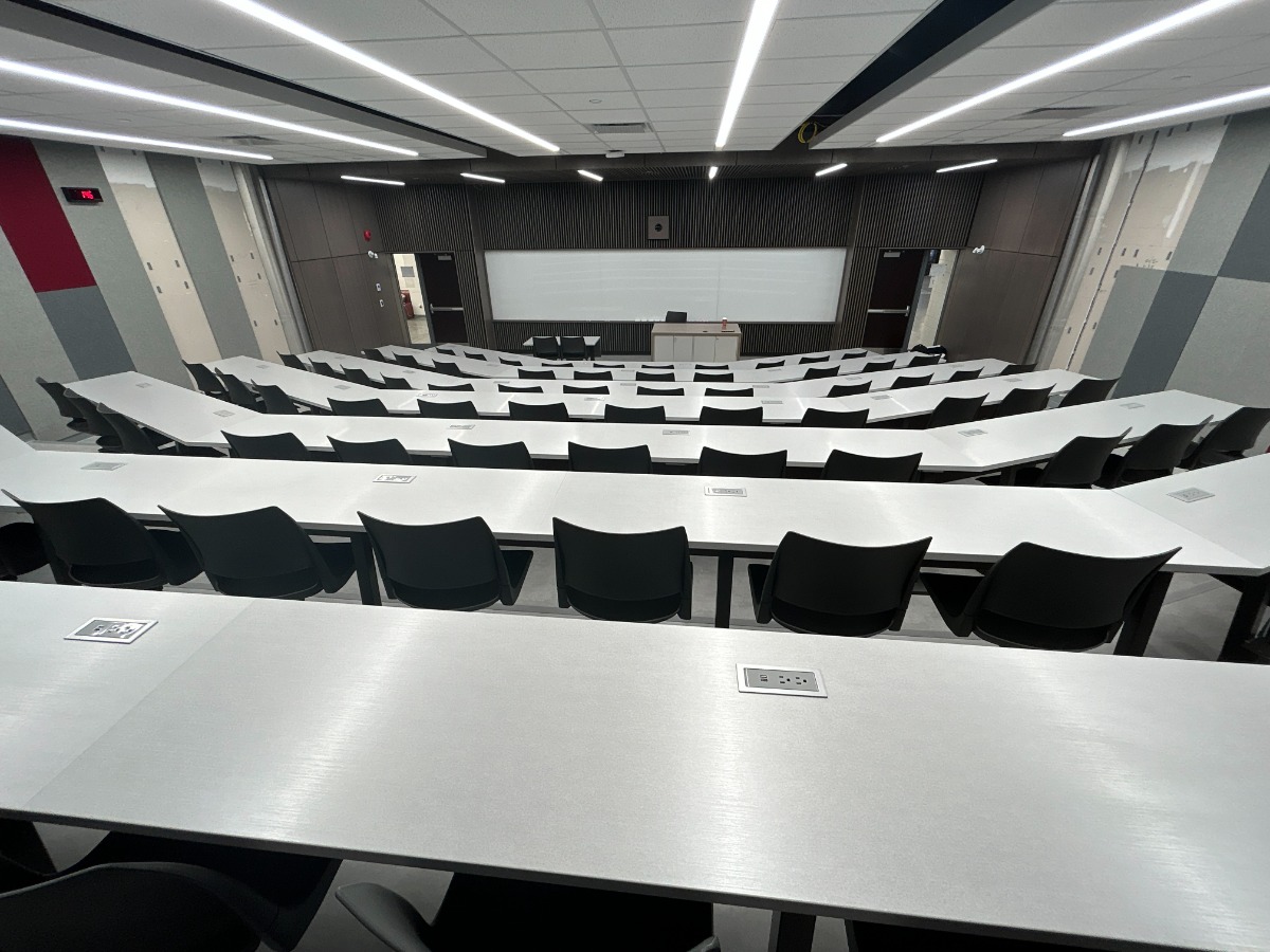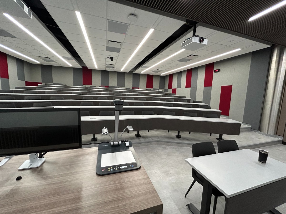 Project consisted of demolition of existing finishes, installation of new audio-visual system, VAV, lighting and architectural finishes throughout lecture rooms. These finishes included new wood panelling, paint, ceilings, flooring and furniture.